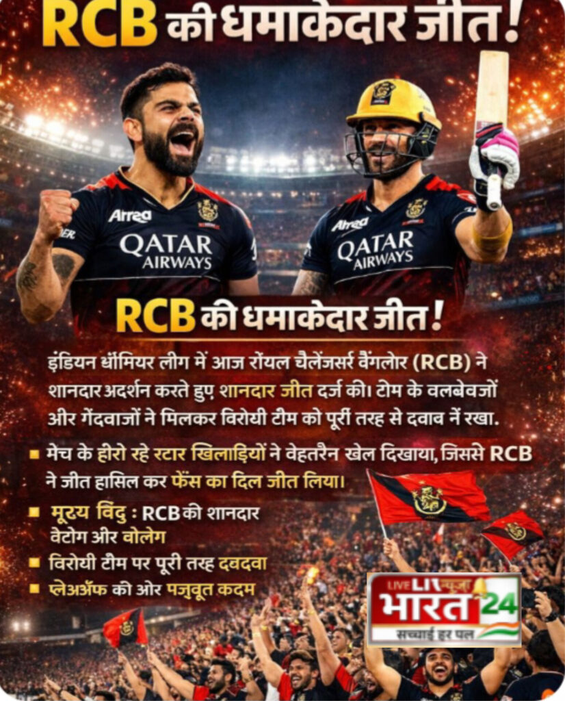 लाइव न्यूज भारत24: बलवाड़ा: खरगोन              -: इंडियन प्रीमियर लीग में आज रॉयल चैलेंजर्स बैंगलोर (RCB) ने शानदार प्रदर्शन करते हुए शानदार जीत दर्ज की। टीम के बल्लेबाजों और गेंदबाजों ने मिलकर विरोधी टीम को पूरी तरह से दबाव में रखा।