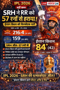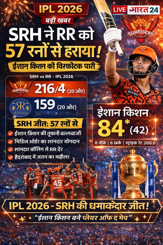 Sunrisers Hyderabad ने IPL 2026 के बलवाड़ा : रोमांचक मुकाबले में शानदार प्रदर्शन करते हुए Rajasthan Royals को 57 रनों से करारी शिकस्त दी। यह मुकाबला पूरी तरह हैदराबाद के नाम रहा, जहां बल्लेबाजी और गेंदबाजी दोनों में टीम ने दबदबा बनाया।