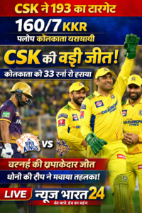 CSK ने पहले बल्लेबाजी करते हुए 193 रनों का मजबूत लक्ष्य खड़ा किया, जिसके जवाब में KKR की टीम 20 ओवर में 160/7 रन ही बना सकी।